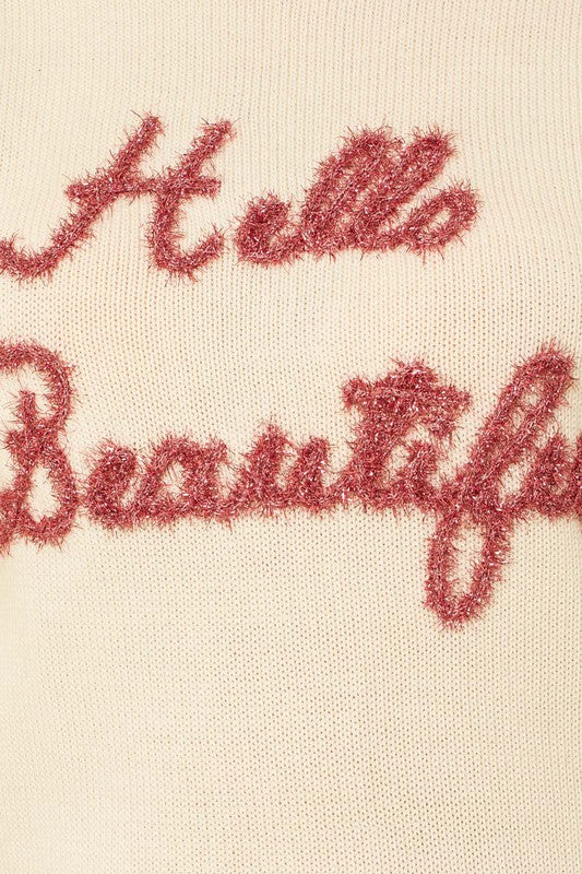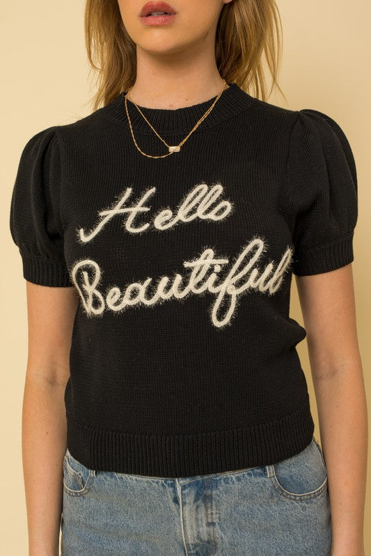 Hello, beautiful! Embrace casual charm with this gorgeous short sleeve sweater top featuring lovely lettering print. The crew neck and bell sleeves add a touch of elegance to this non-sheer, regular fit top.