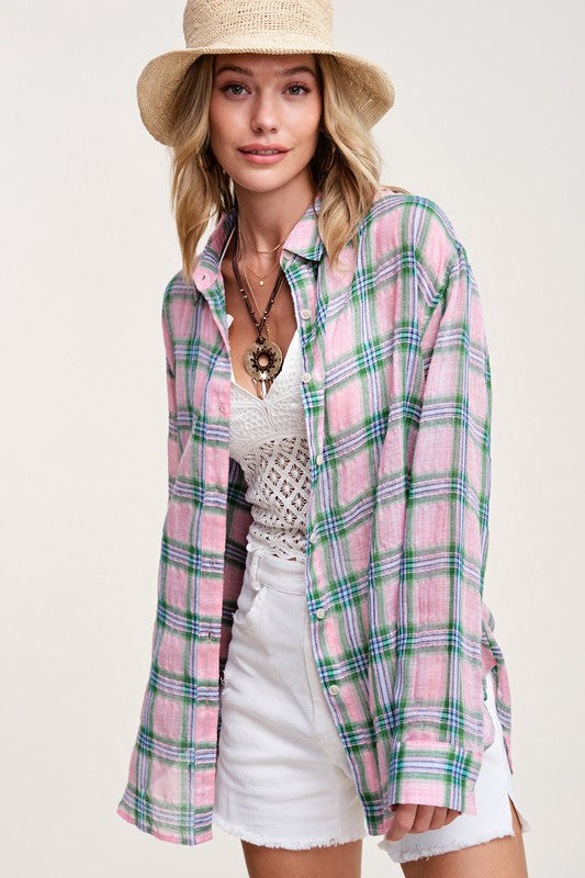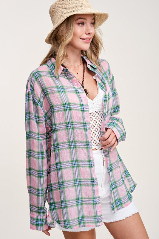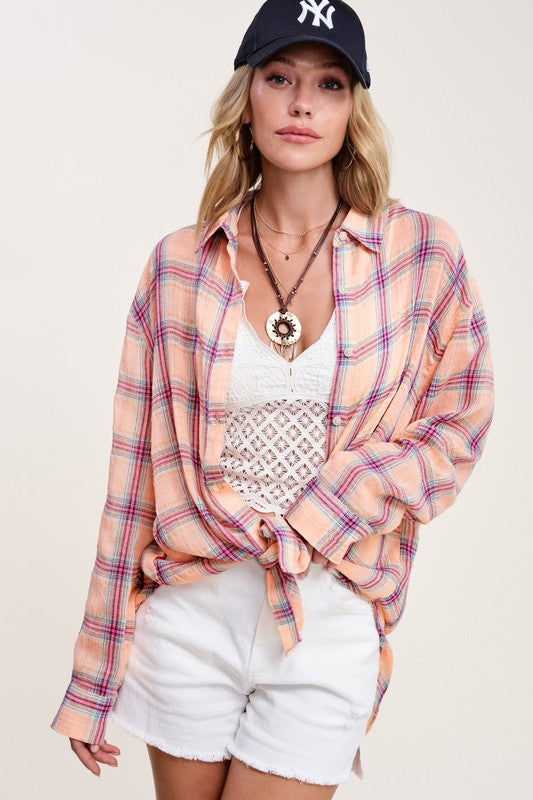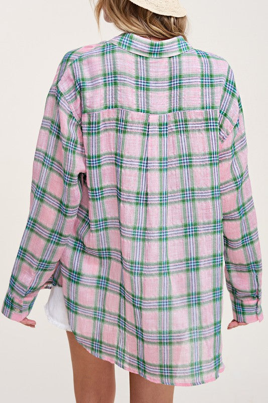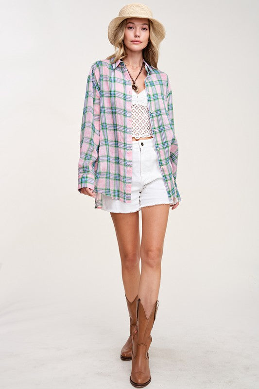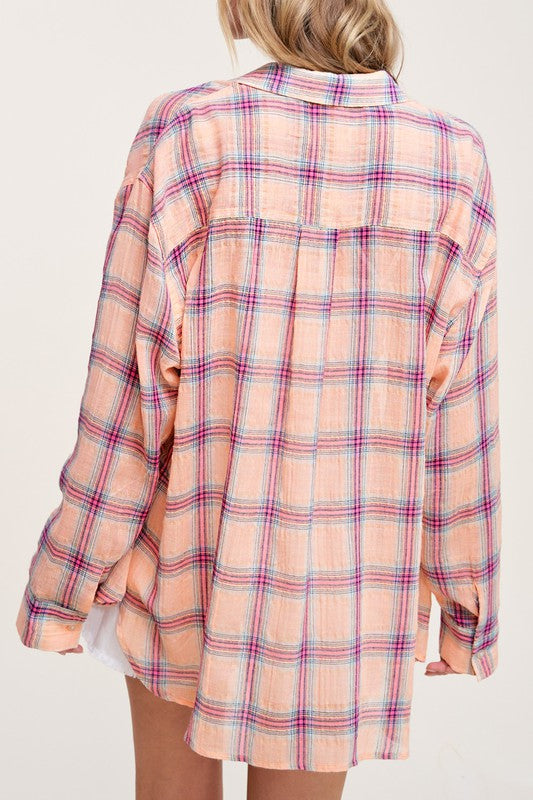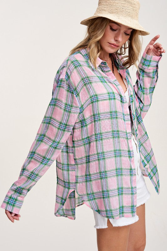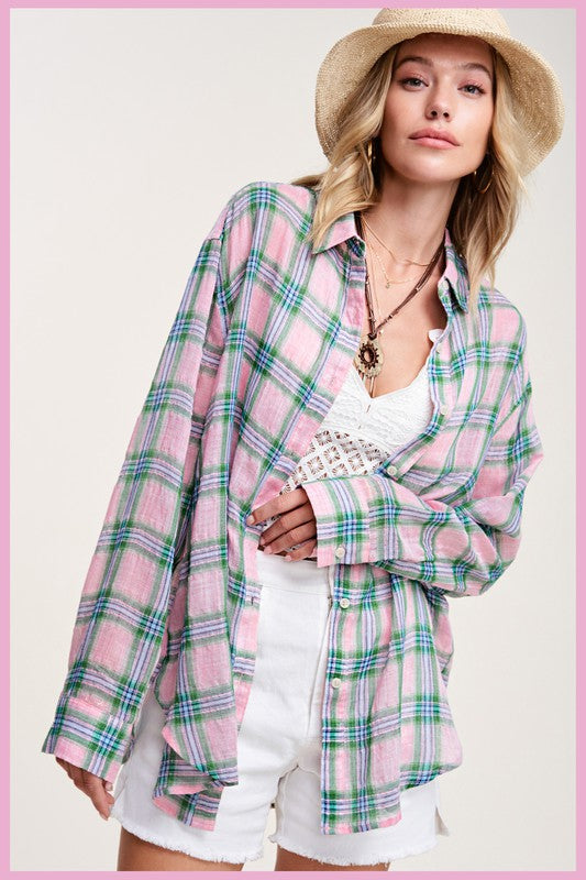 A bold and stylish button-down shirt that effortlessly blends fashion and comfort. This shirt features a striking plaid print and is designed with a relaxed fit, making it a versatile addition to your wardrobe.